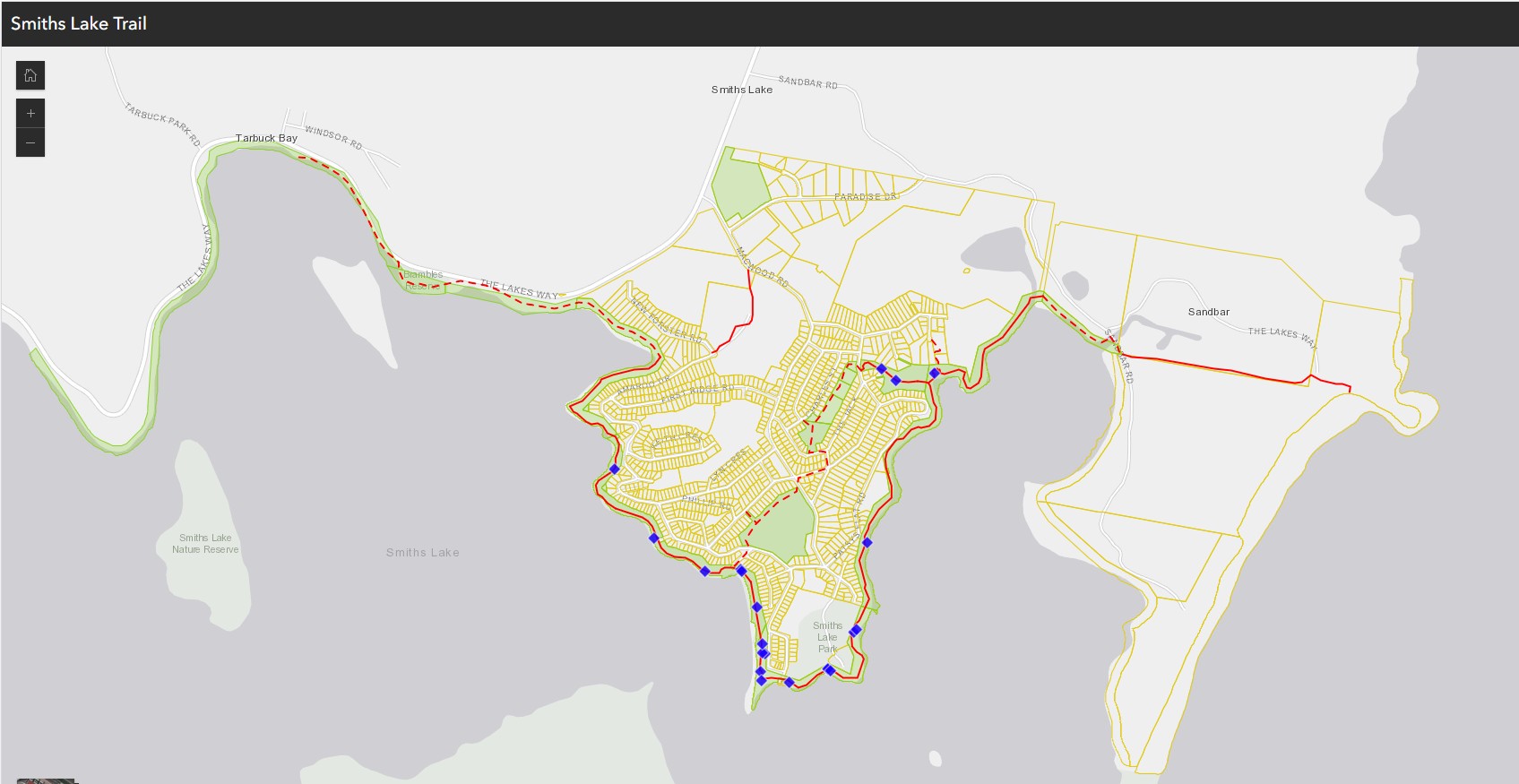 Open High-Water Trail: A 12.6km bush walking trail connecting Tarbuck Bay, Smiths Lake Village foreshore, and Cellito Beach Boardwalk. Graded 2 to 3, the High-Water Trail links many long-established foreshore tracks into a single, cohesive walk - currently in development.