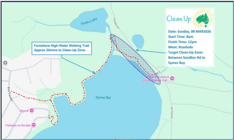 Open Our volunteer Clean-Up Day program focuses on the Smiths Lake Village Foreshore, Green Spaces, and surrounding precinct areas. Β Β On Sunday, 8 March 2026, we targeted the lakeside foreshore along Sandbar Road, Smiths Lake NSW. Ten community volunteers, and the assistance of Sandbar/Bushland camping park staff, recovered and disposed of a total of 1.06 tonne of abandoned materials and rubbish.