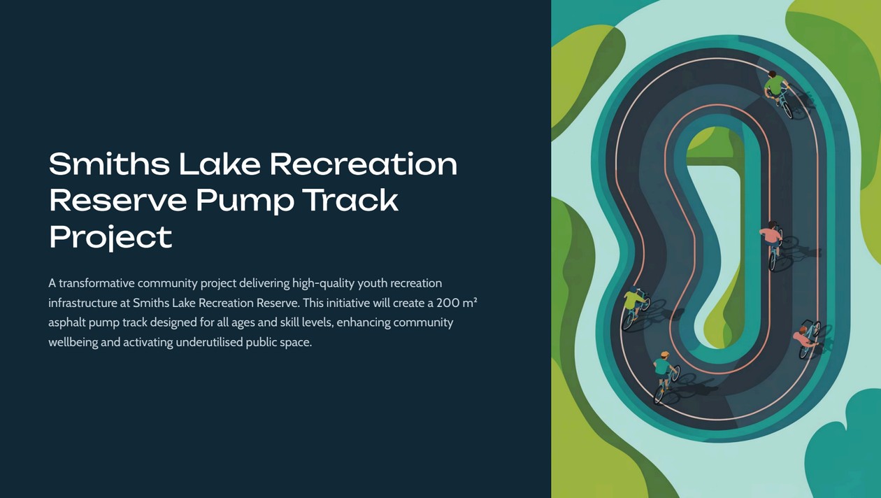 Open Pump Track Development:- A site-specific PUMP TRACK design to extend the existing skate bowl including DRAINAGE and GROUND WORKS for the entire reserve. Design funding included a $5,000 federal grant and $5,000 contribution from PPCA funds. Additionally, a federal grant application for $250,000 has been submitted, with the funding outcome announcement expected after April 1, 2026.